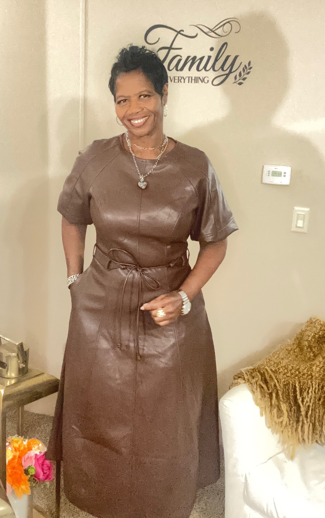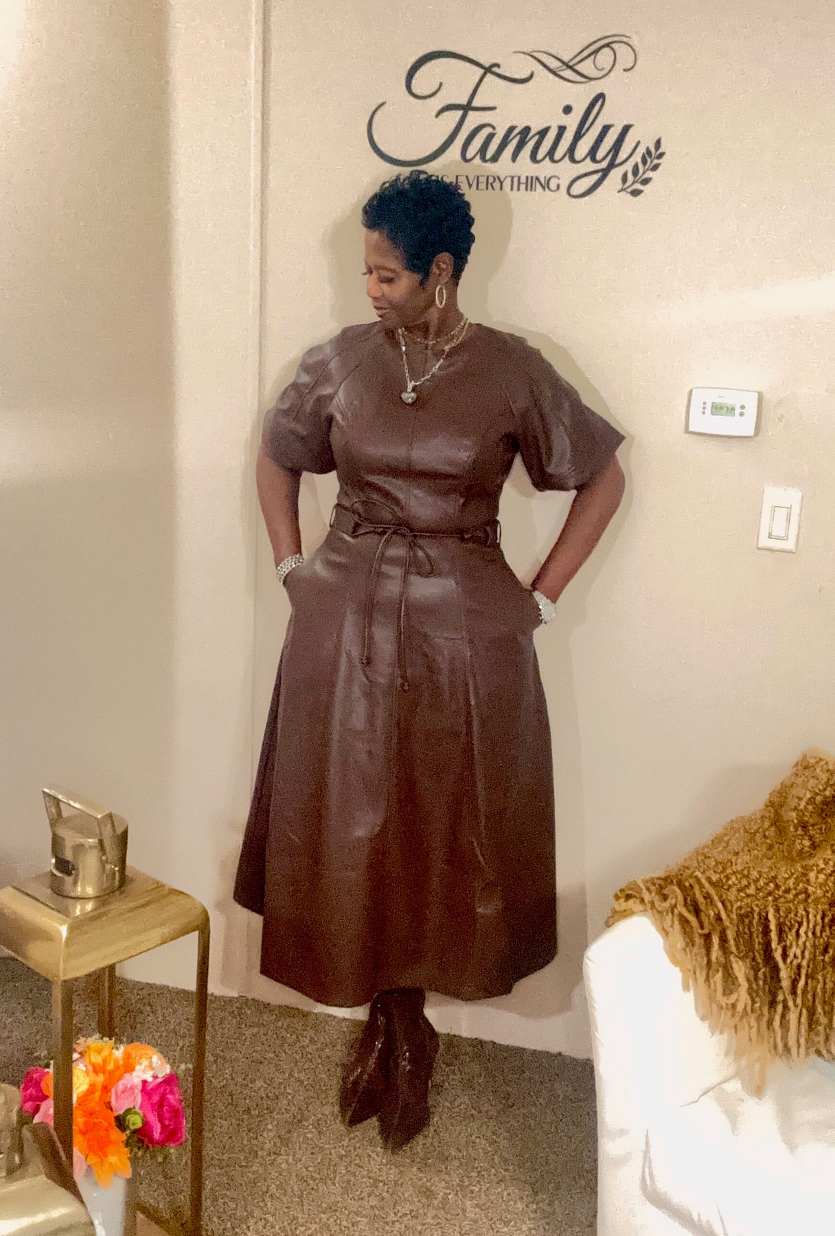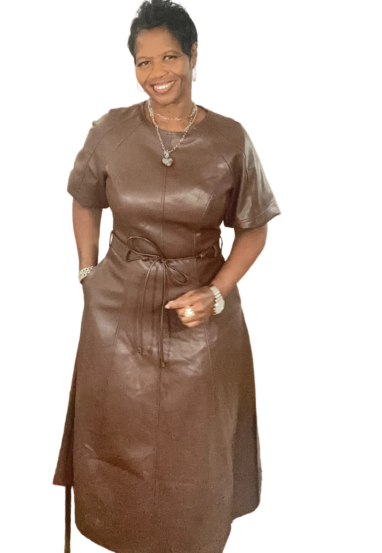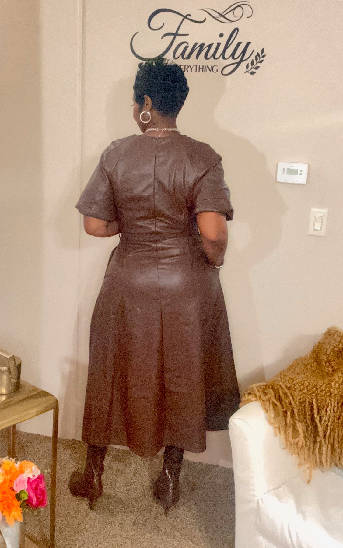 Short sleeve faux leather A-Line dress