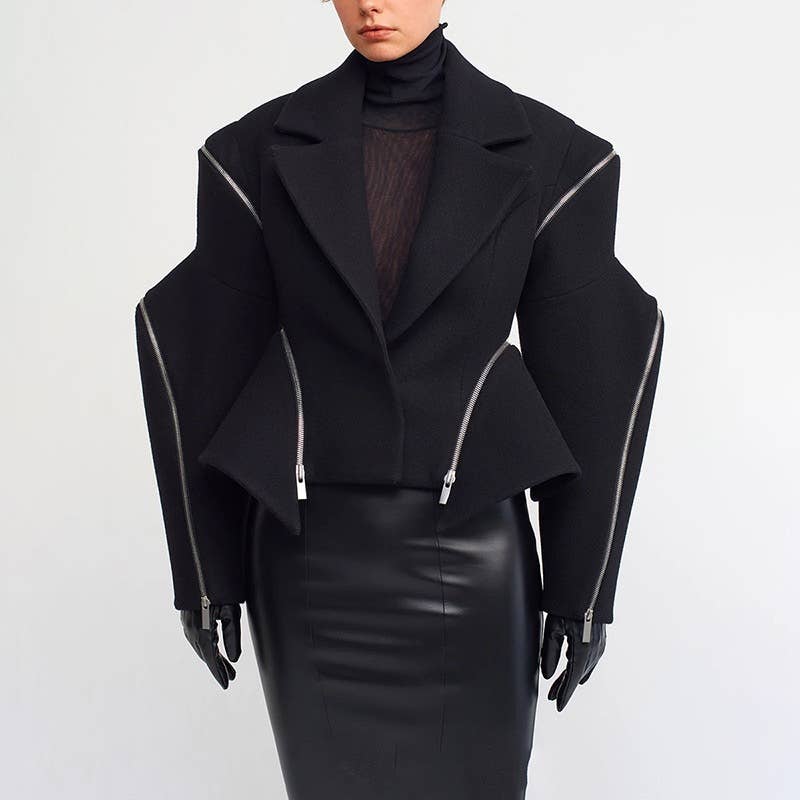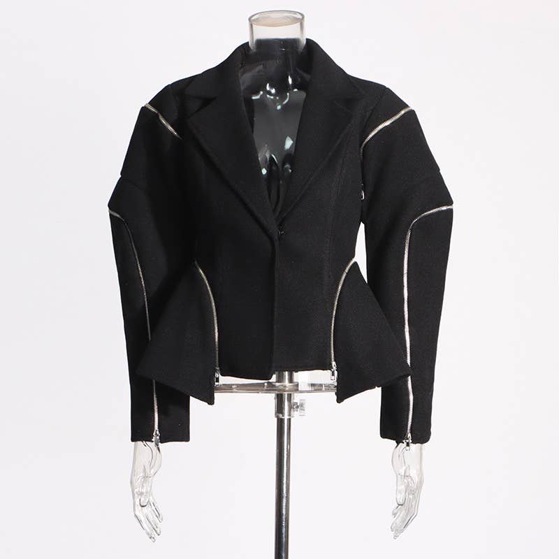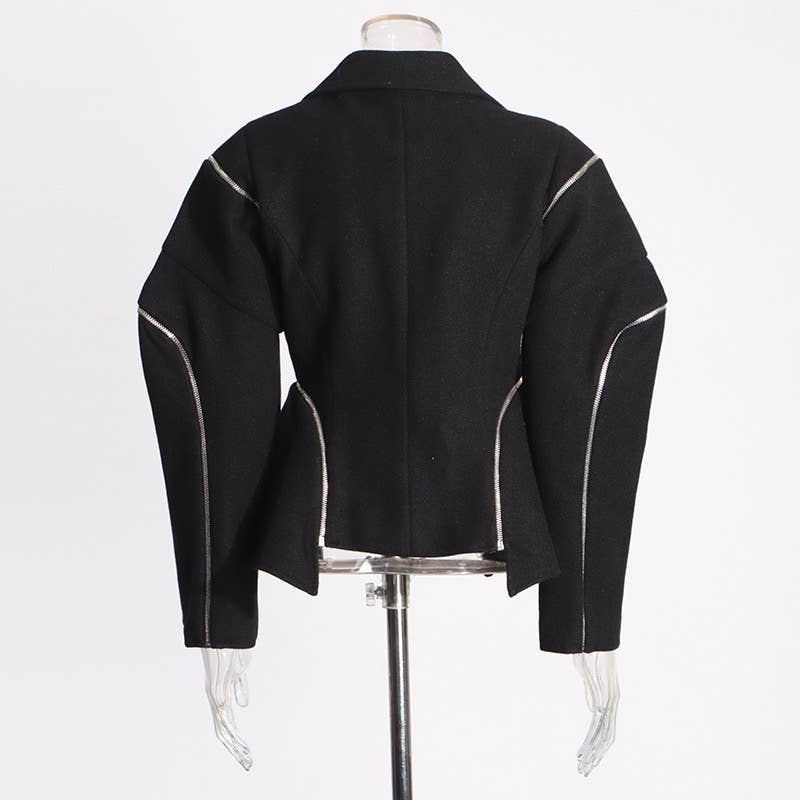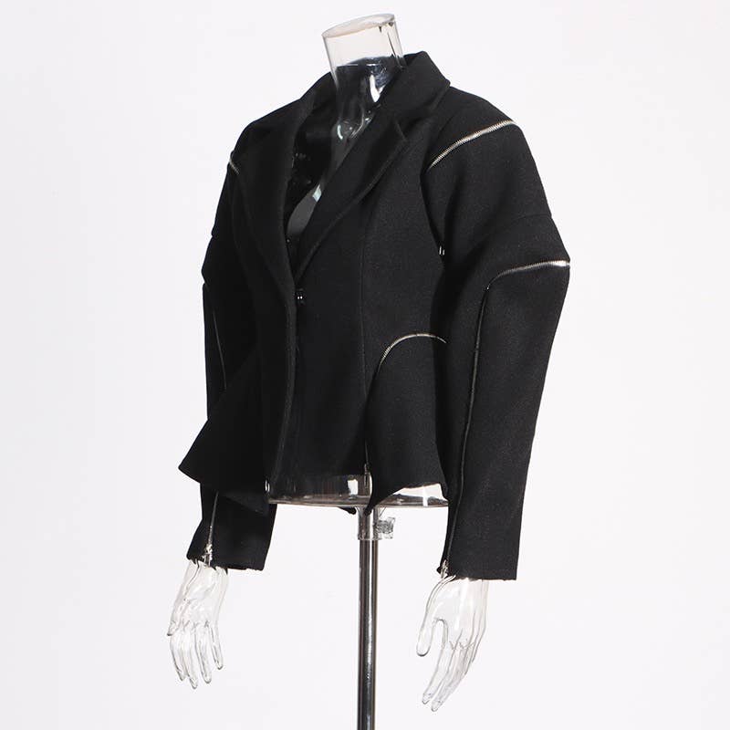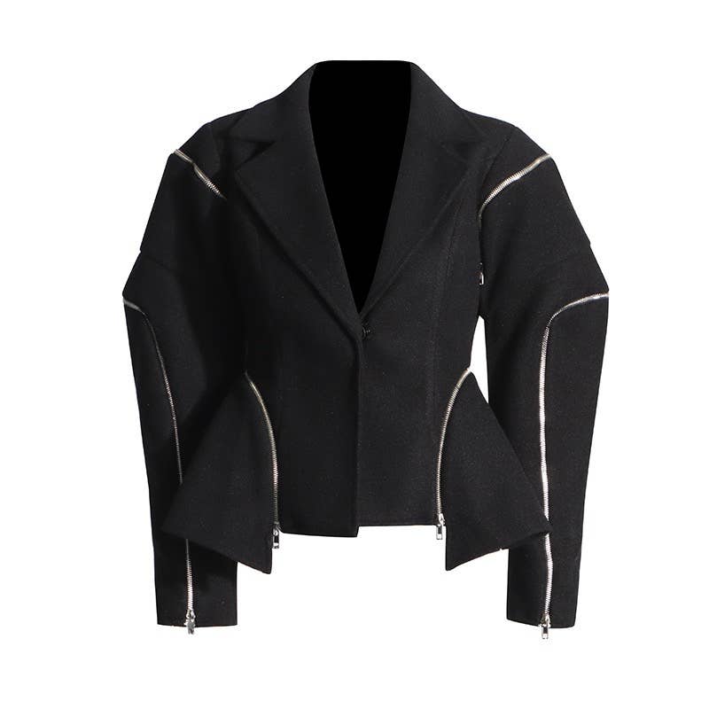 Elevate your fashion game with our "Edgy Moto Flight Jacket," a cutting-edge piece designed for the modern woman. This jacket features an innovative suit collar with an irregular cut, long sleeves that can be detached to suit any season, and a high-waisted design that flatters the figure. The black fabric is accented with bold white stitching, and dual zippers add both function and flair. Crafted from durable materials, this jacket is perfect for those who live life on the fast lane and appreciate a blend of style and practicality. Whether you're cruising the streets or making a statement in the urban jungle, this jacket is your ticket to a chic, rebellious look.