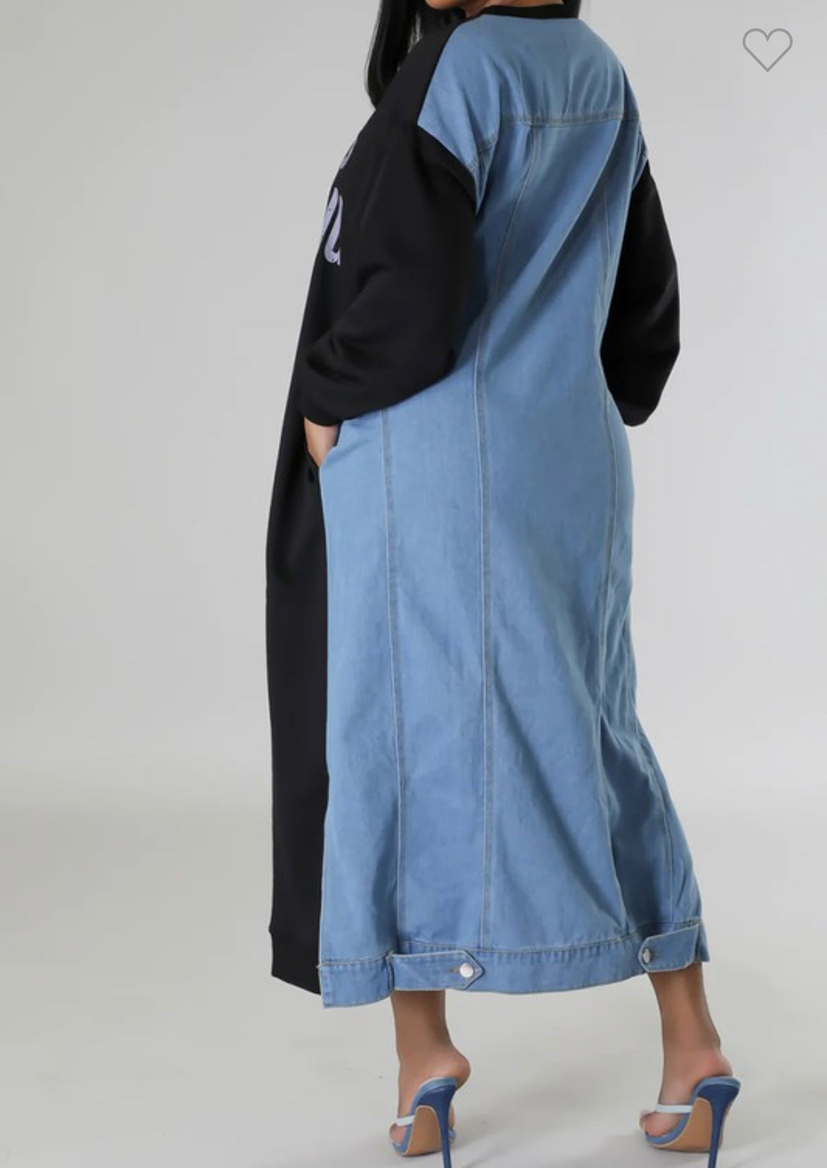 Sweatshirt half denim stretchy maxi dress with side pockets