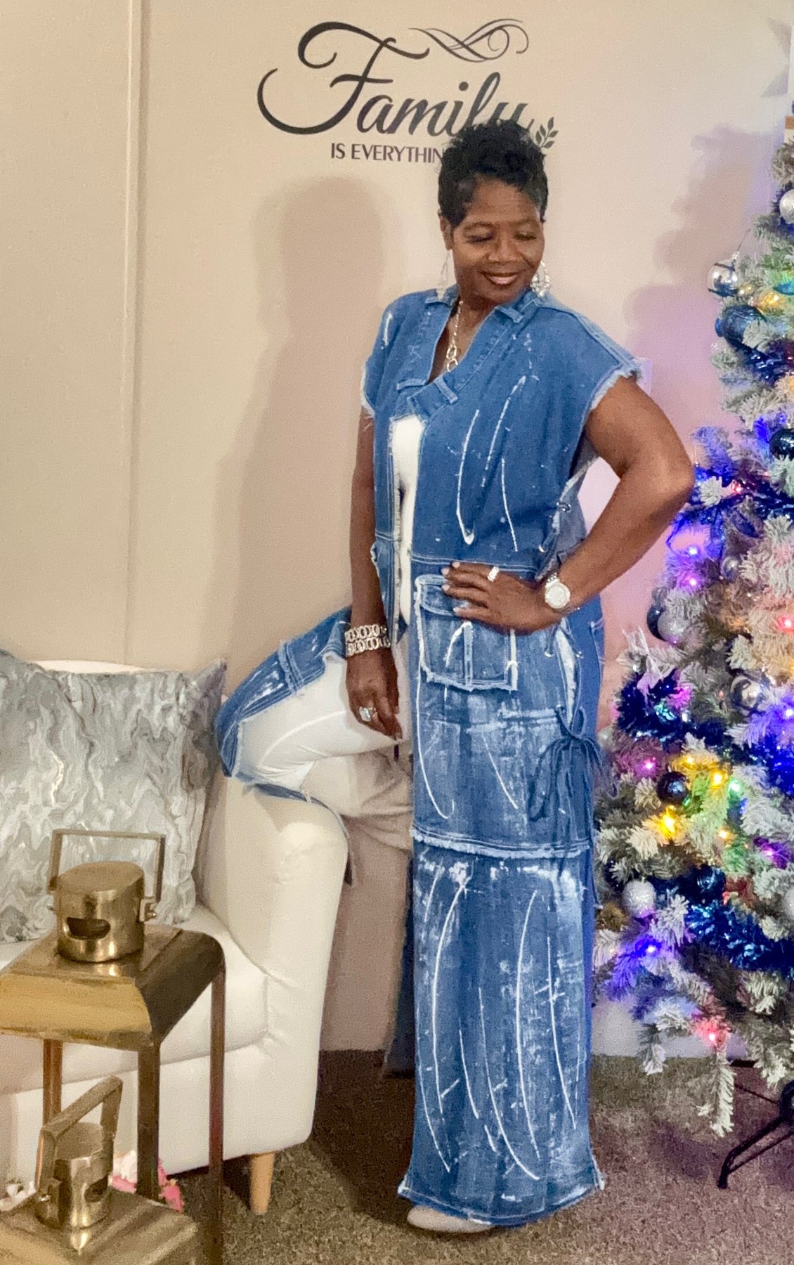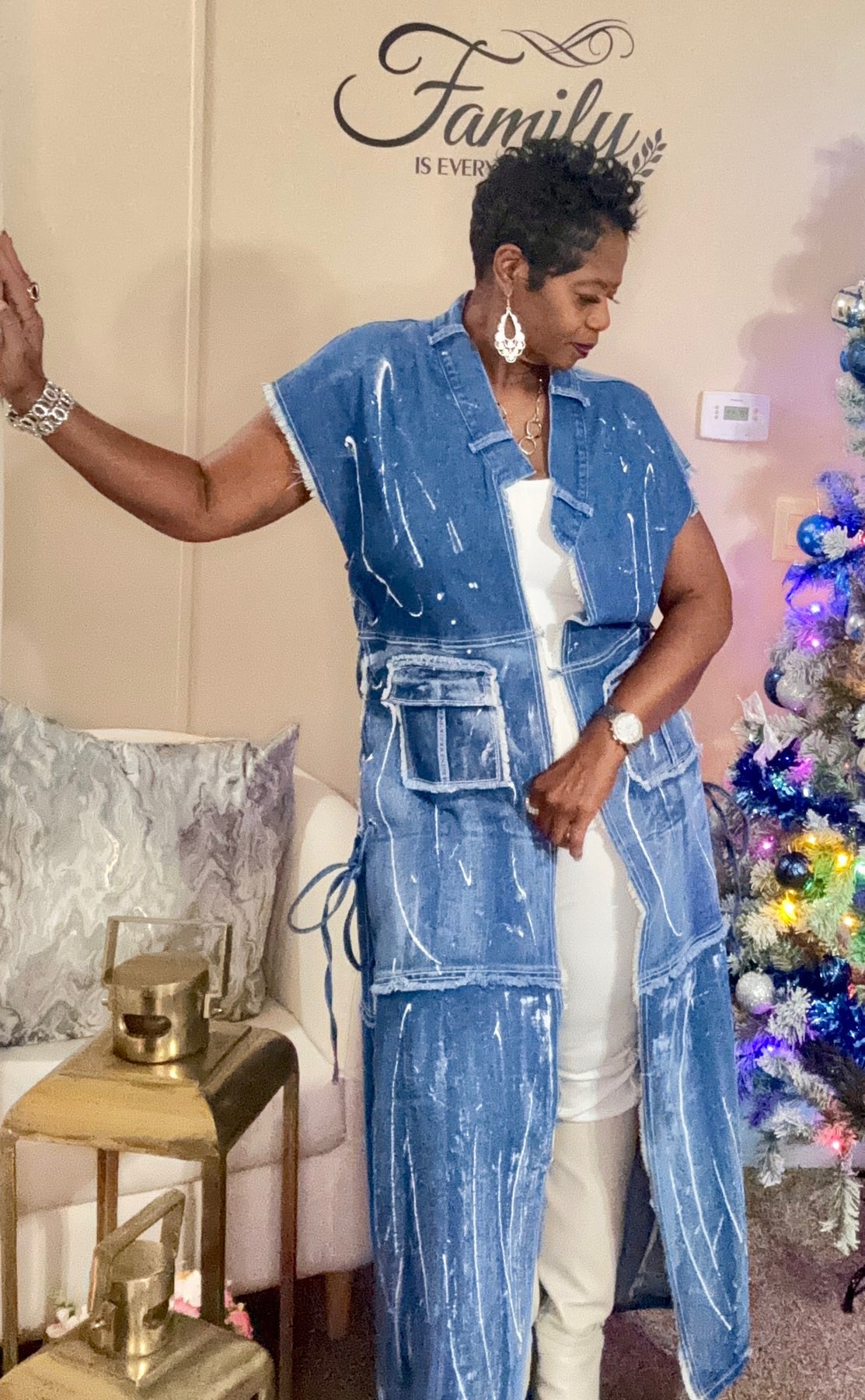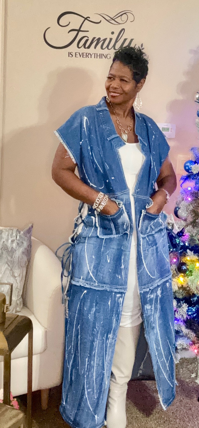 Denim open cardigan with open sides and denim string closure. Oversized with side and back pockets