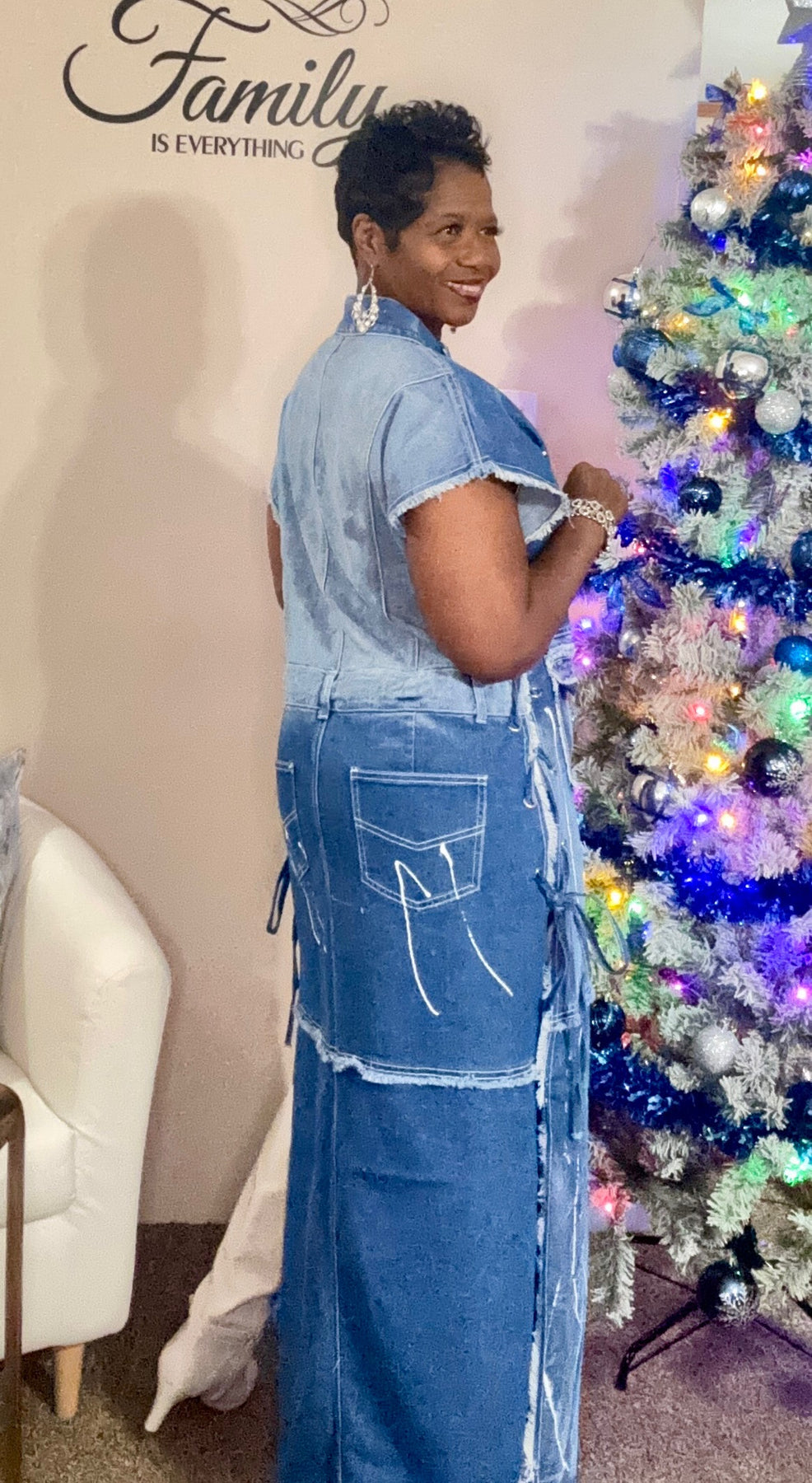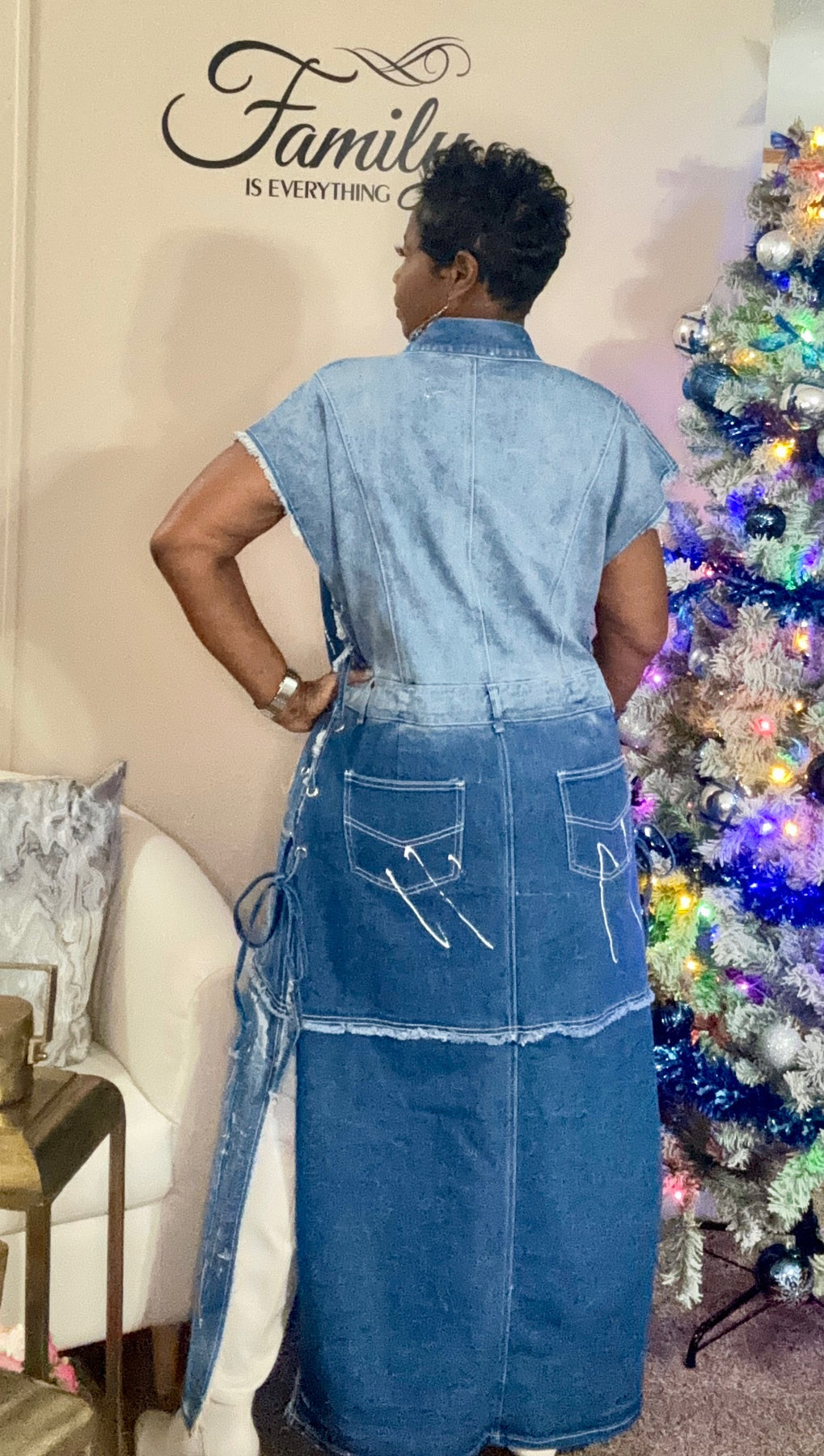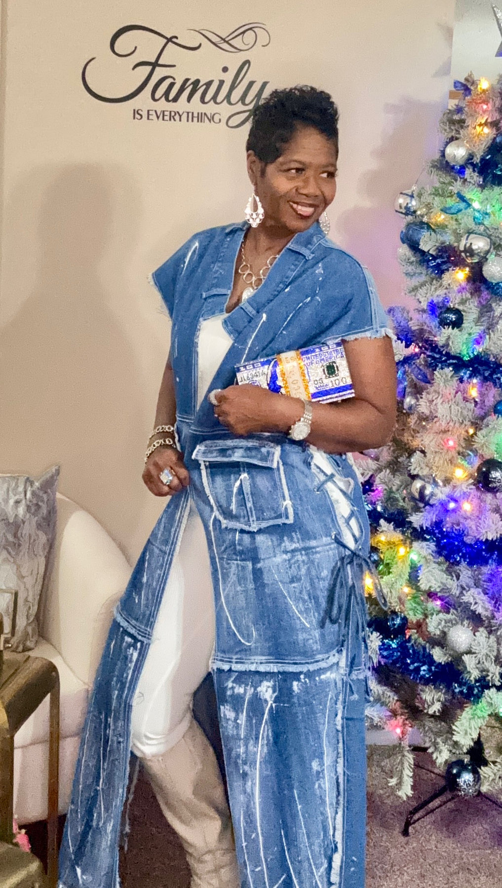 Denim open cardigan with open sides and denim string closure. Oversized with side and back pockets