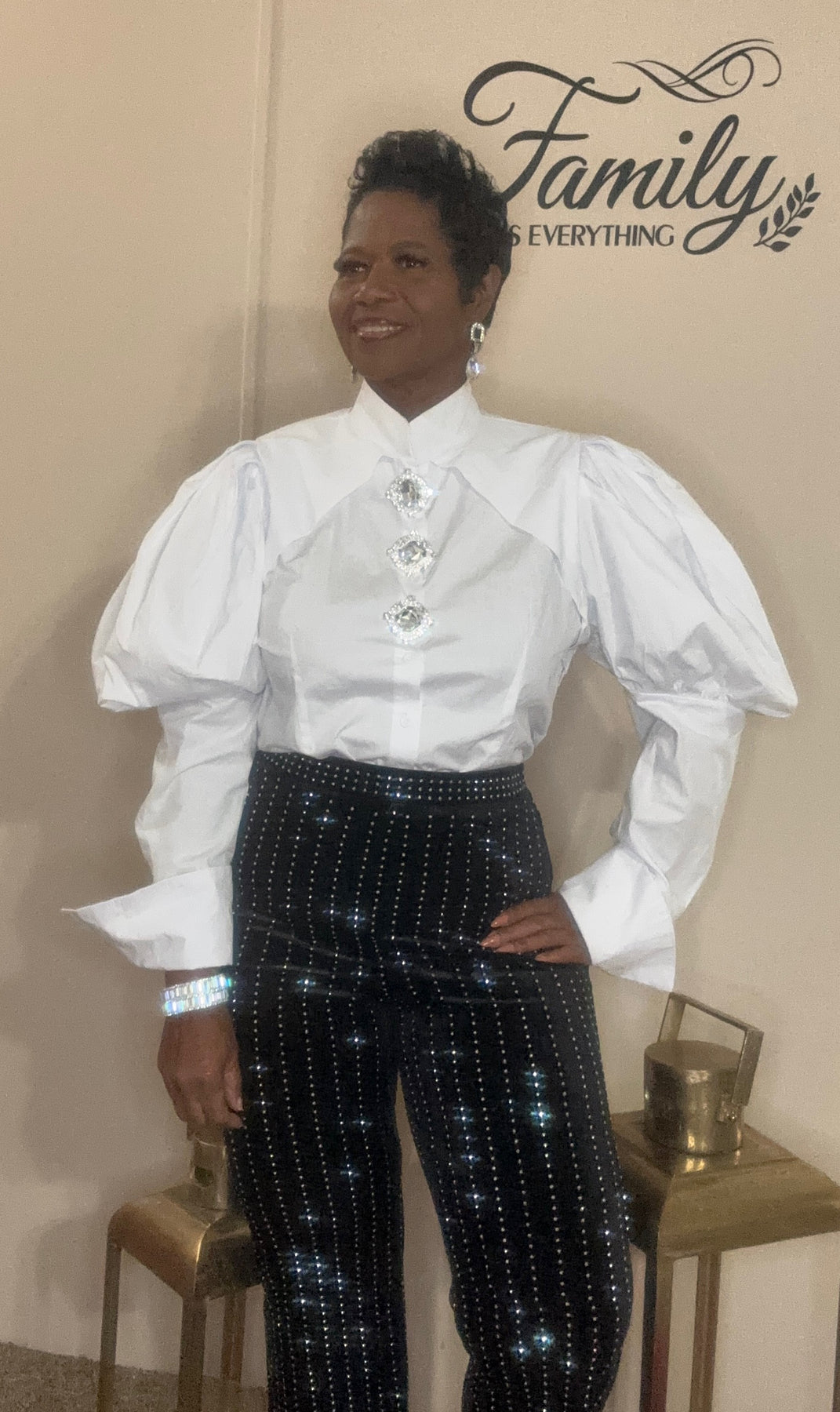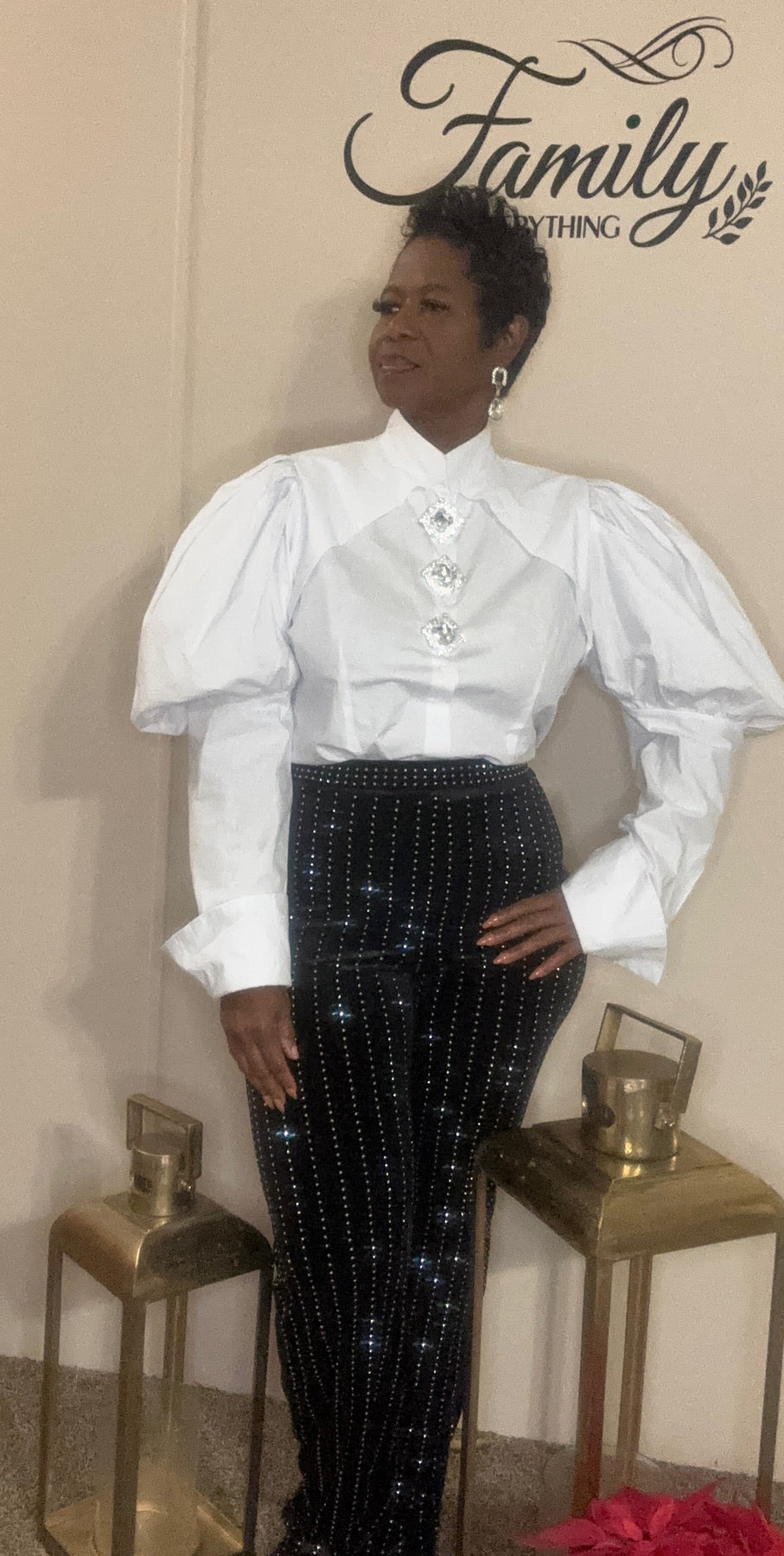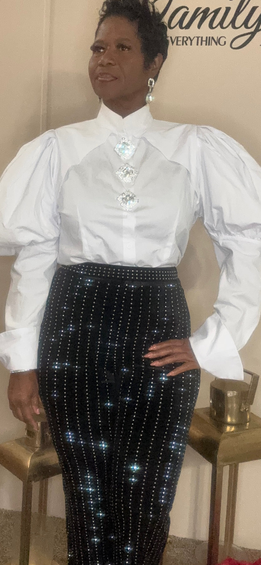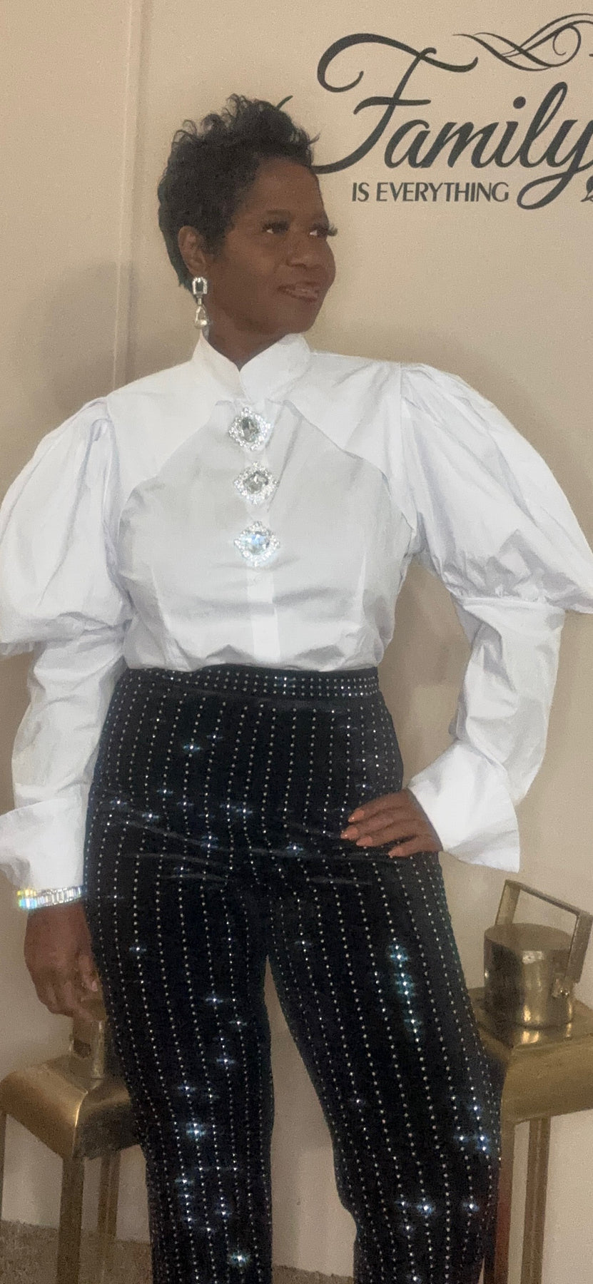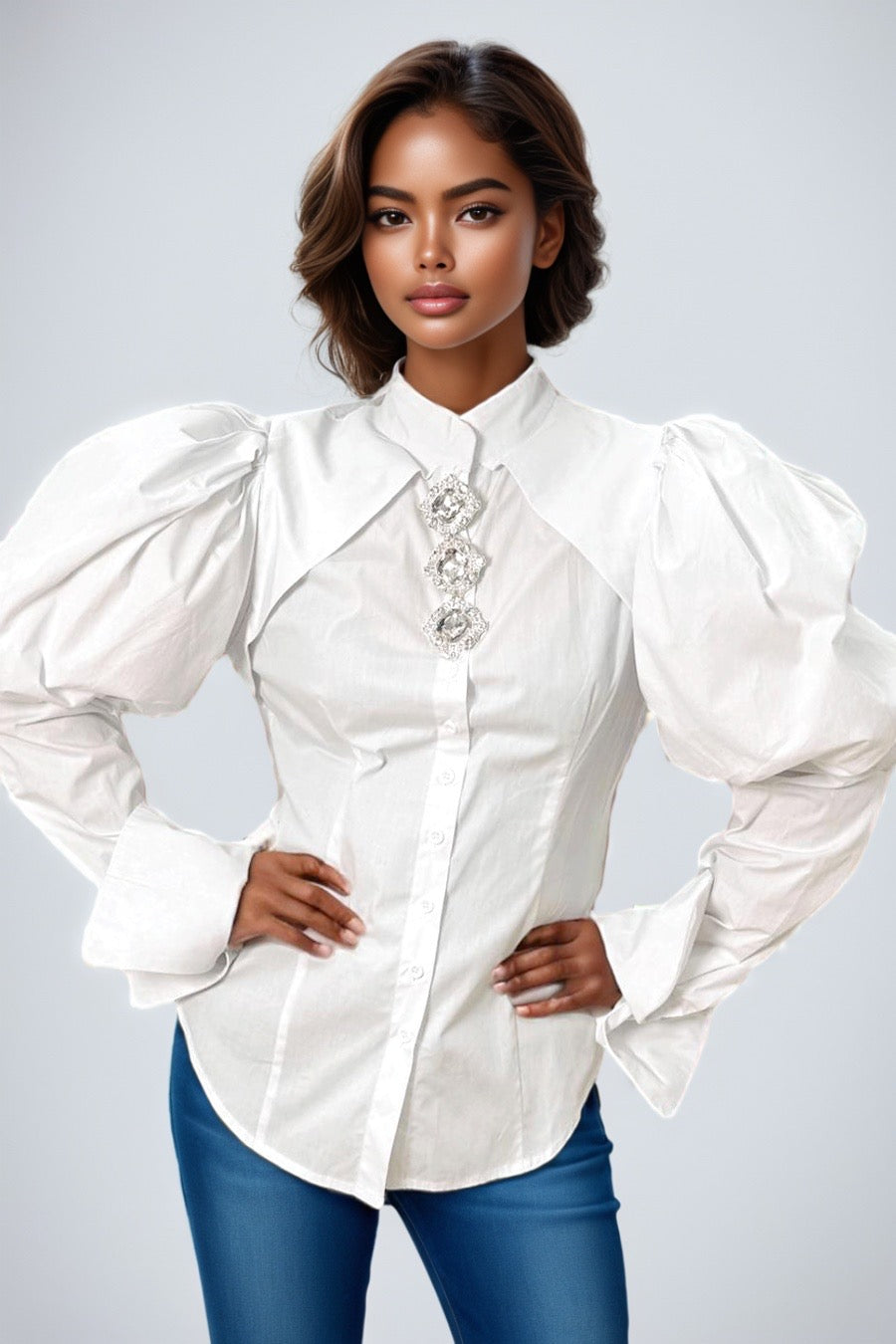 White long sleeve cuffed top with rhinestone buttons and turn down collar