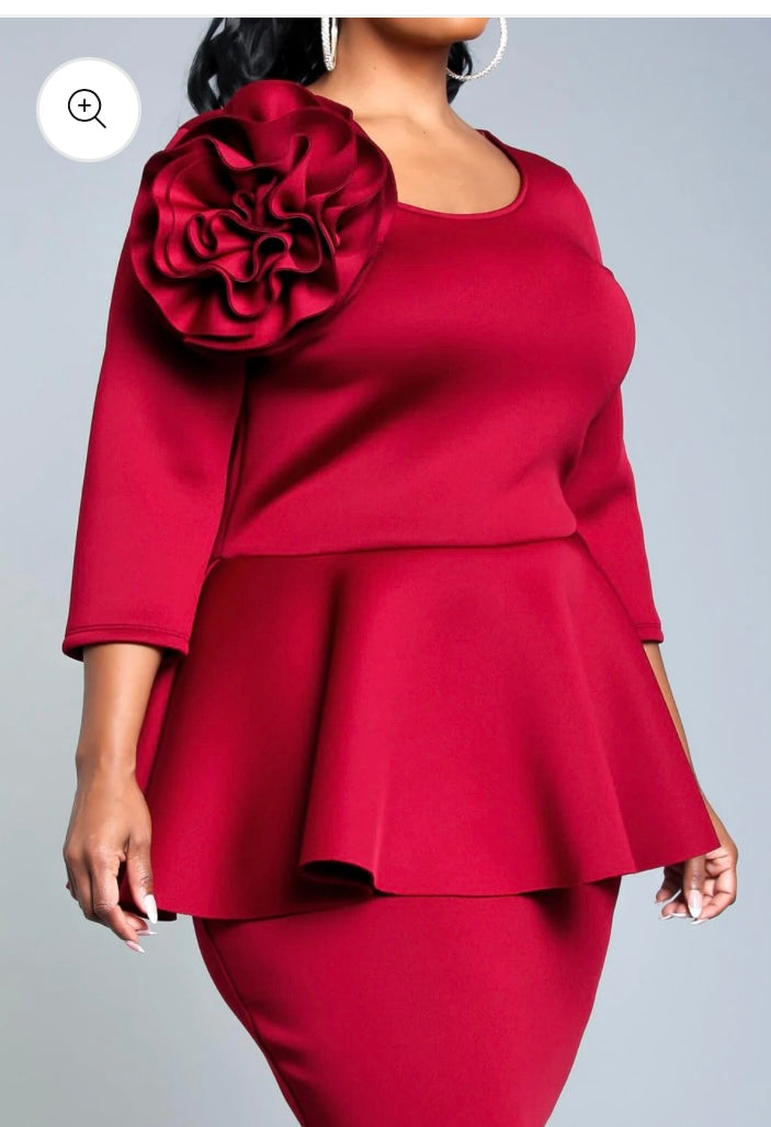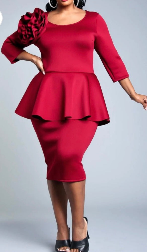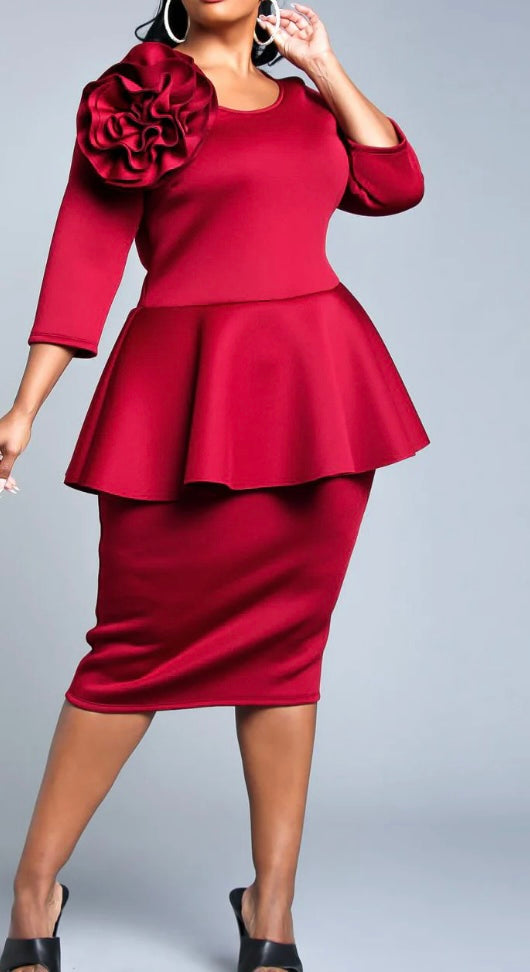 Solid peplum scuba dress with side top attached rose.  Long sleeve zipper back closure