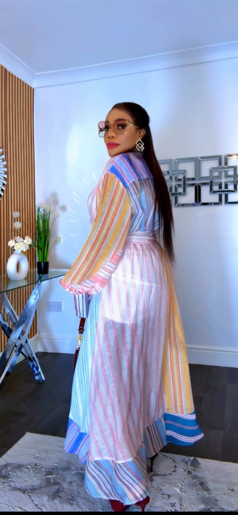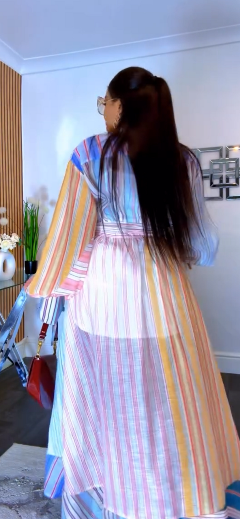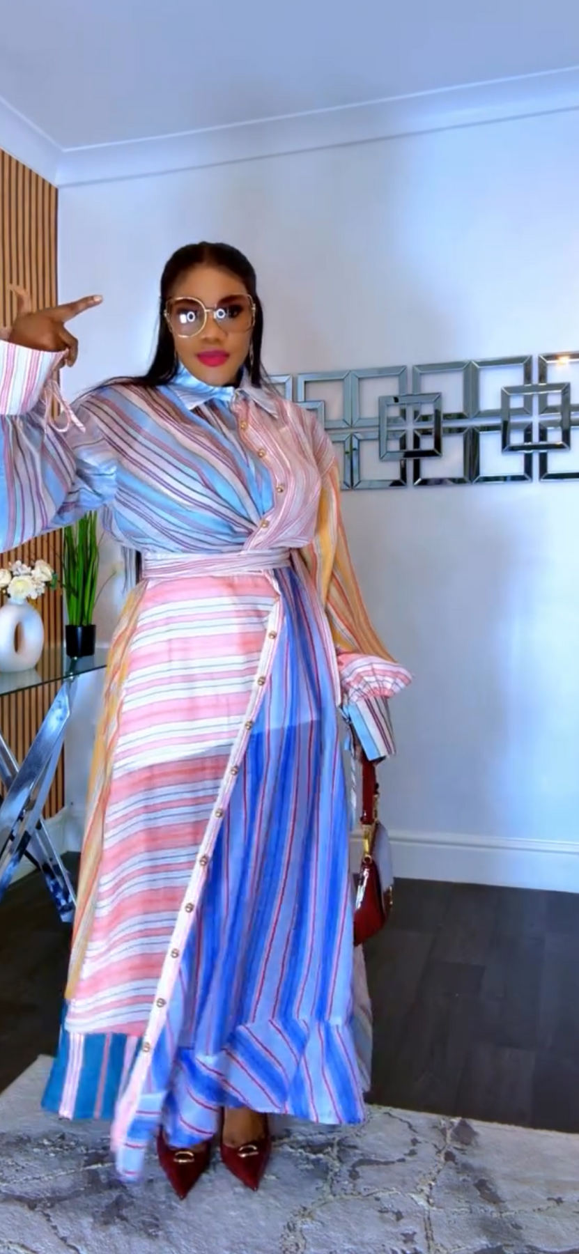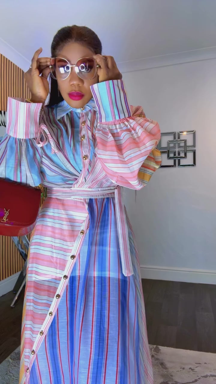 Maxi tee shirt style dress front button down bell sleeve high collar striped dress