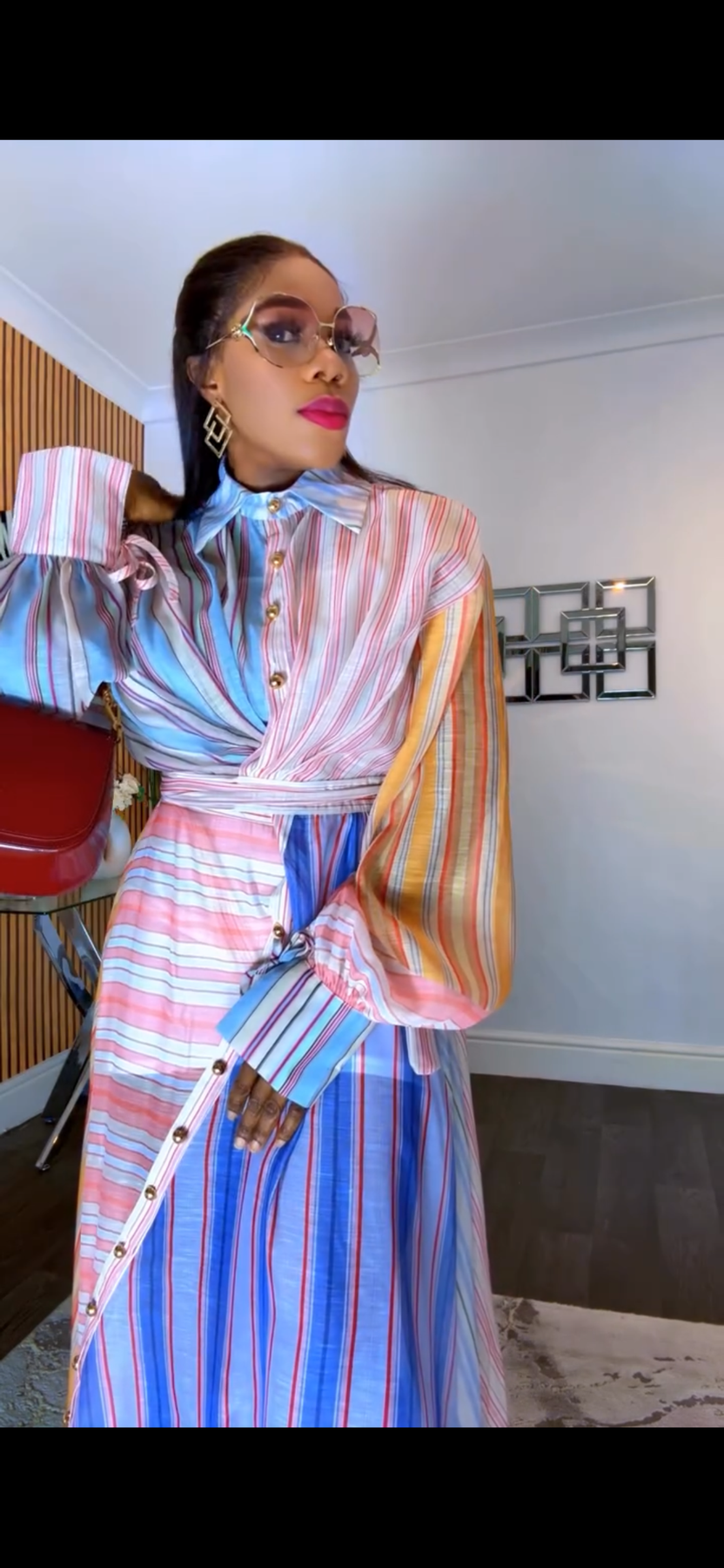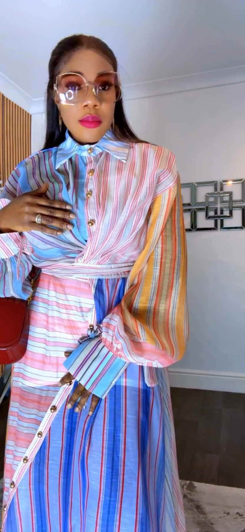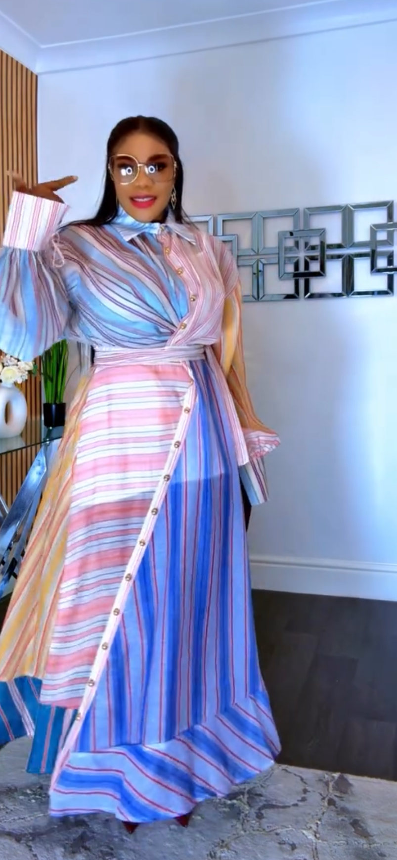 Maxi tee shirt style dress front button down bell sleeve high collar striped dress