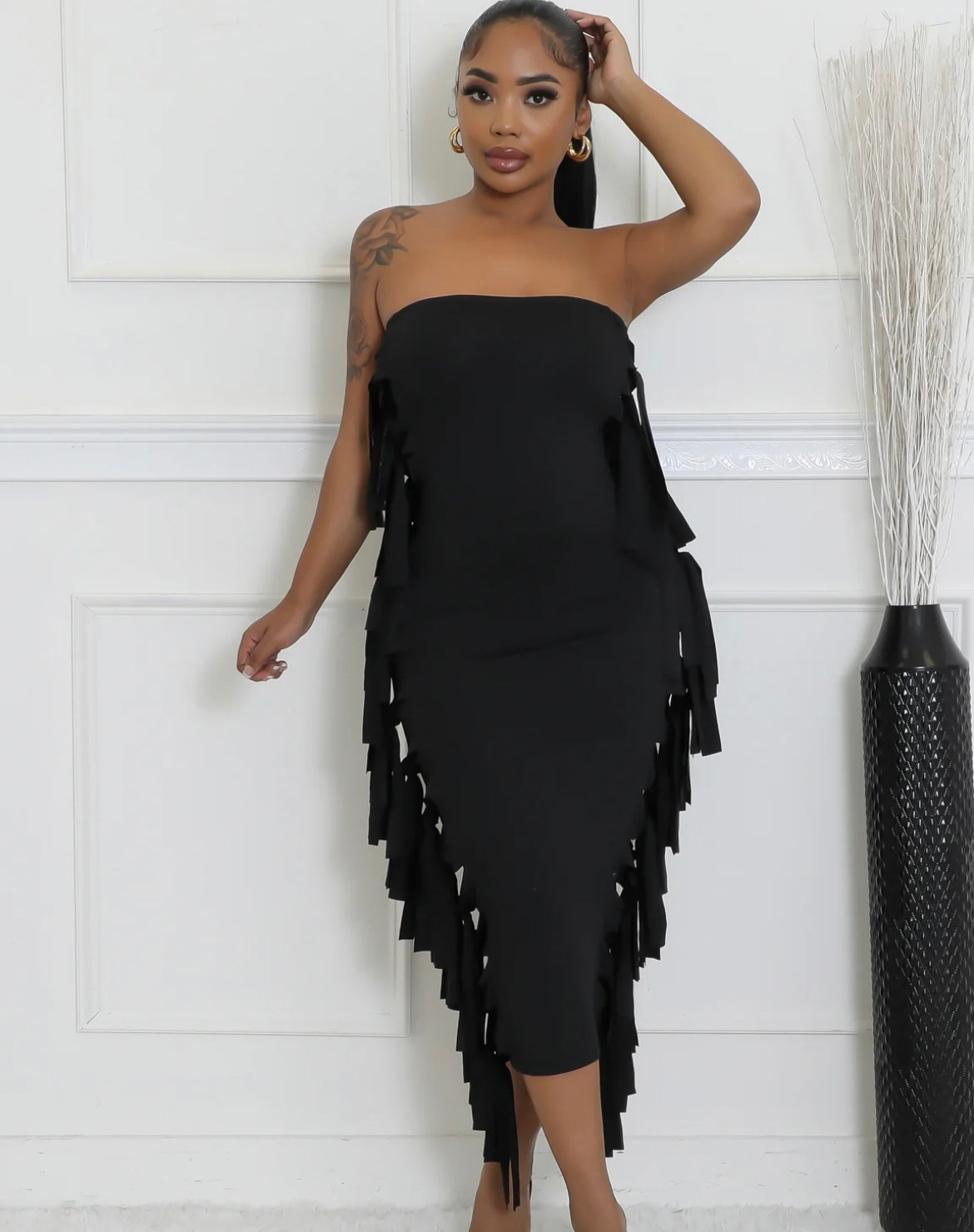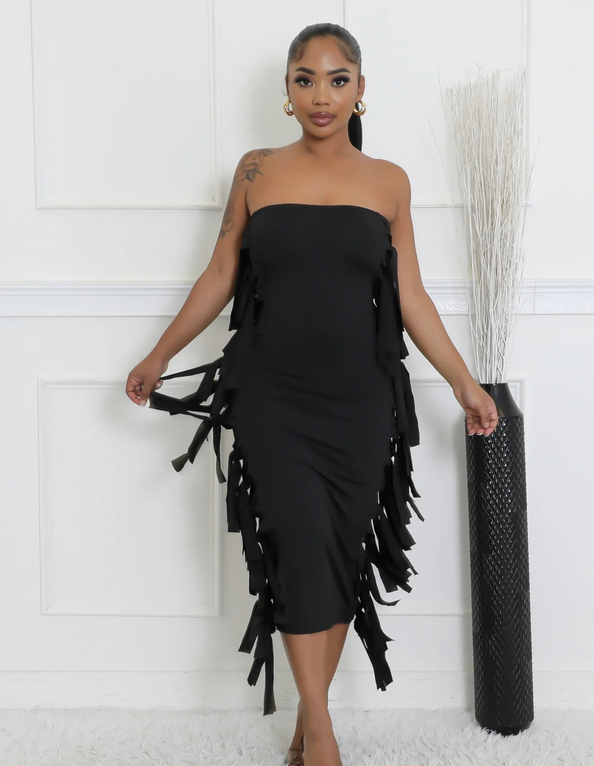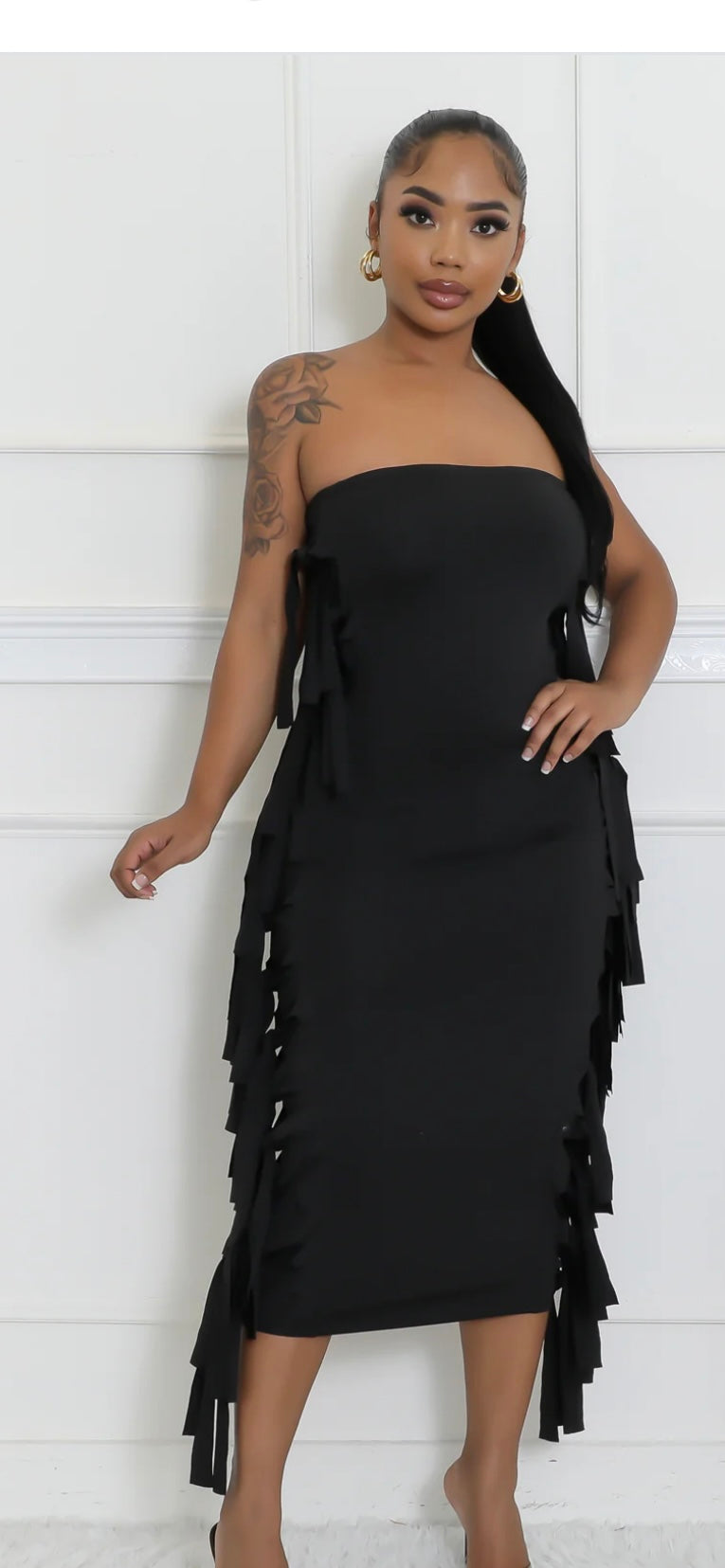 Tube bodycom dress fitted to knee with side fringe top to bottom