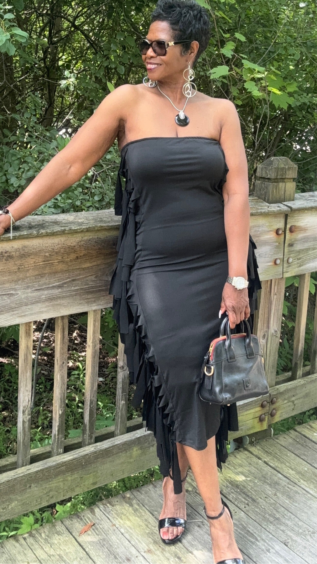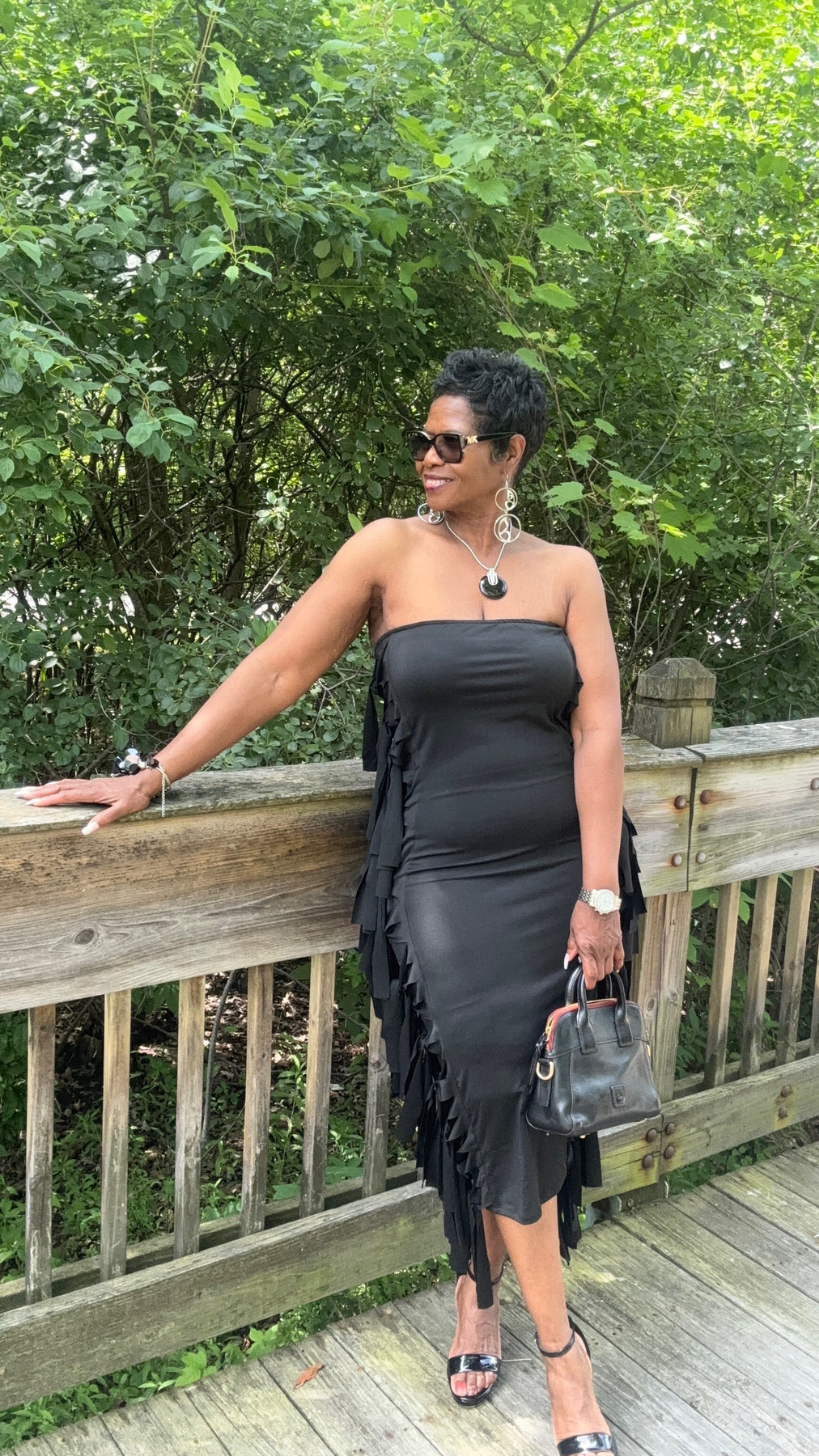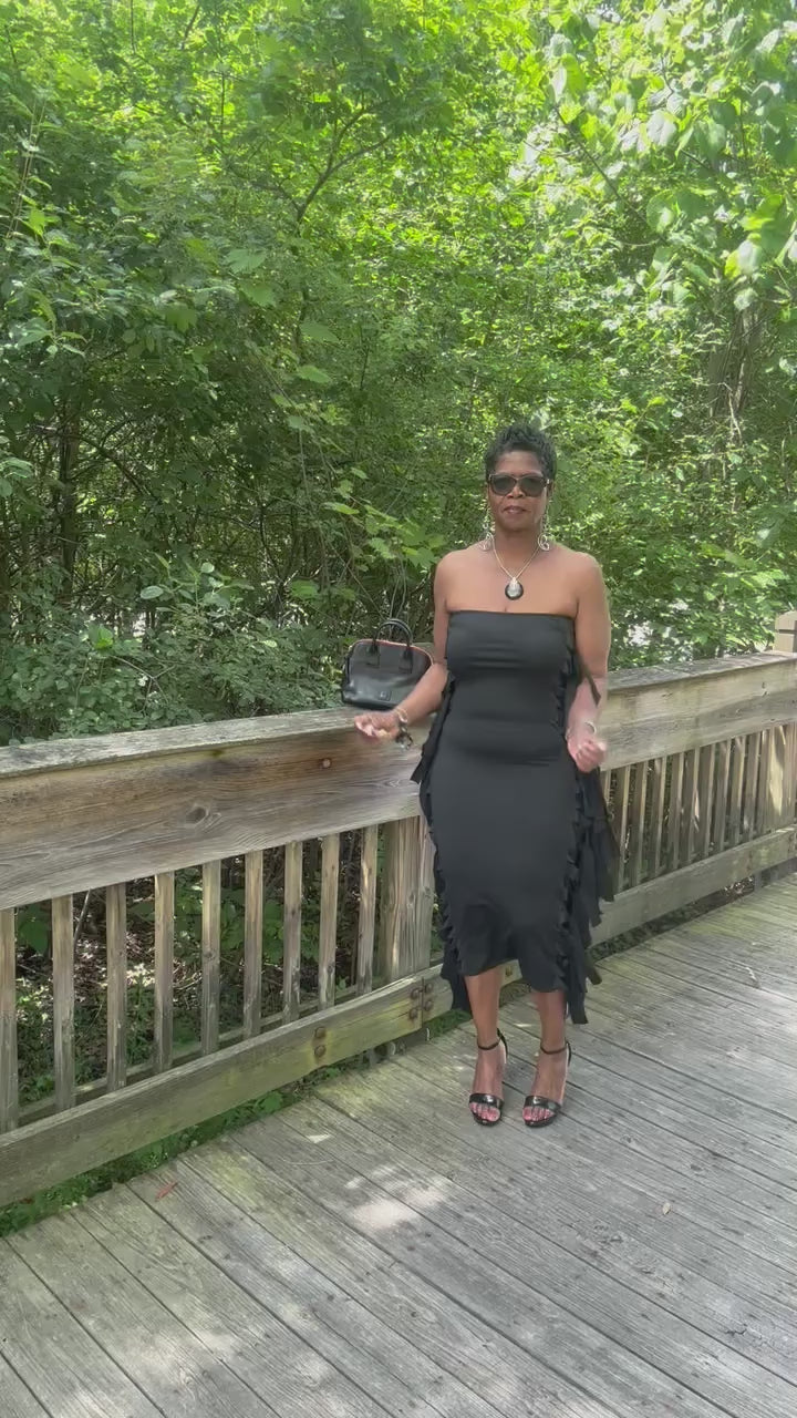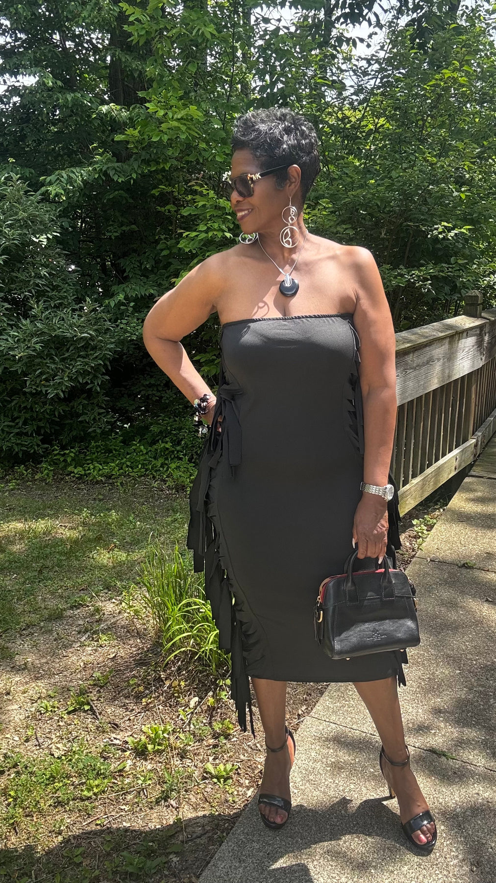 Tube bodycom dress fitted to knee with side fringe top to bottom